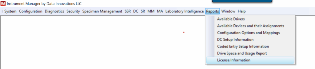 Every base Instrument Manager system has a license number tied to the system. The license number can be found in the bottom left hand corner of your Instrument Manager screen. It can also be found under the license report in the Reports Tab > License Information and the Help > About Instrument Manager. The license report contains valuable information such as licensed number of connections, End User Workstations, and features of IM. Your IM License number is required when logging tickets with Customer Support.