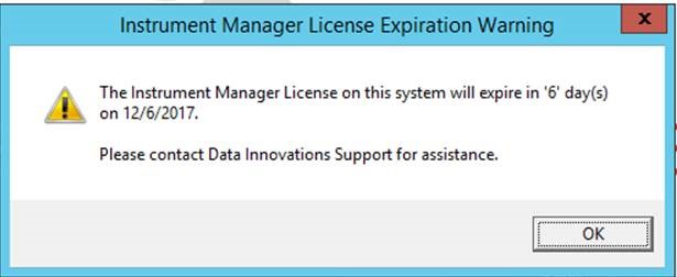 NOTE: License files can be labeled expiring or perpetual in relation to financial milestones. You should contact your assigned implementation resource or sales representative if you receive a pop-up warning of an expiring Instrument Manager license.